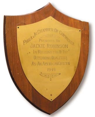 Huge wood and metal plaque was presented to him in his breakout MVP year of 1949. Presented and engraved, "Phila. Jr. Chamber of Commerce Presents to Jackie Robinson In Recognition of the Outstanding Qualities as an American Citizen 1949." Very impressive indeed and huge 20x16". EX.