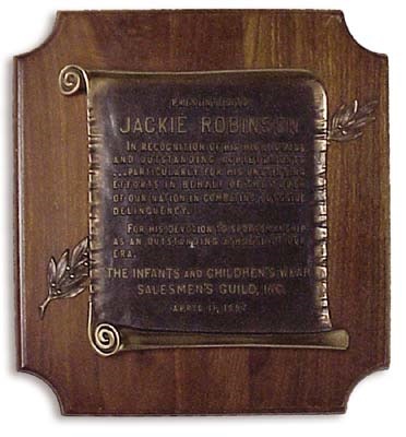 Very attractive bronze and wood is figural with a giant scroll and raised let-tering with olive branch. Presented to him in his retirement year of 1957 by the Children's Wear Salesmen's Guild. In huge letters "Jackie Robinson" with opus to him for his work in fighting juvenile delinquency. Apt for the times, with movies like Blackboard Jungle making teen crime a big issue. Pays homage as an "Outstanding Athlete of Our Era." Very solid 15x15" is marked by the "International Bronze Tablet Co." EX-MT.