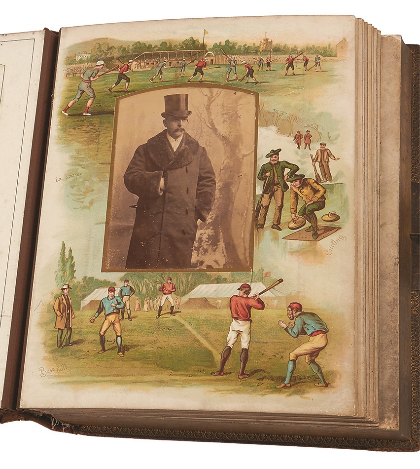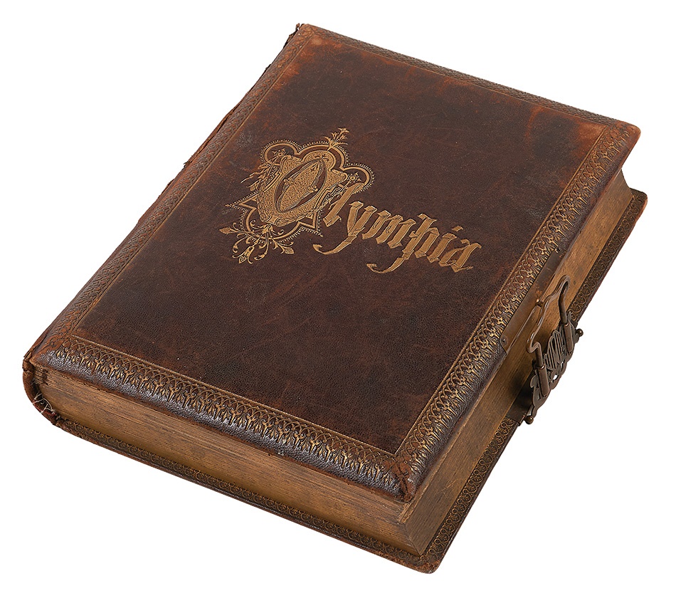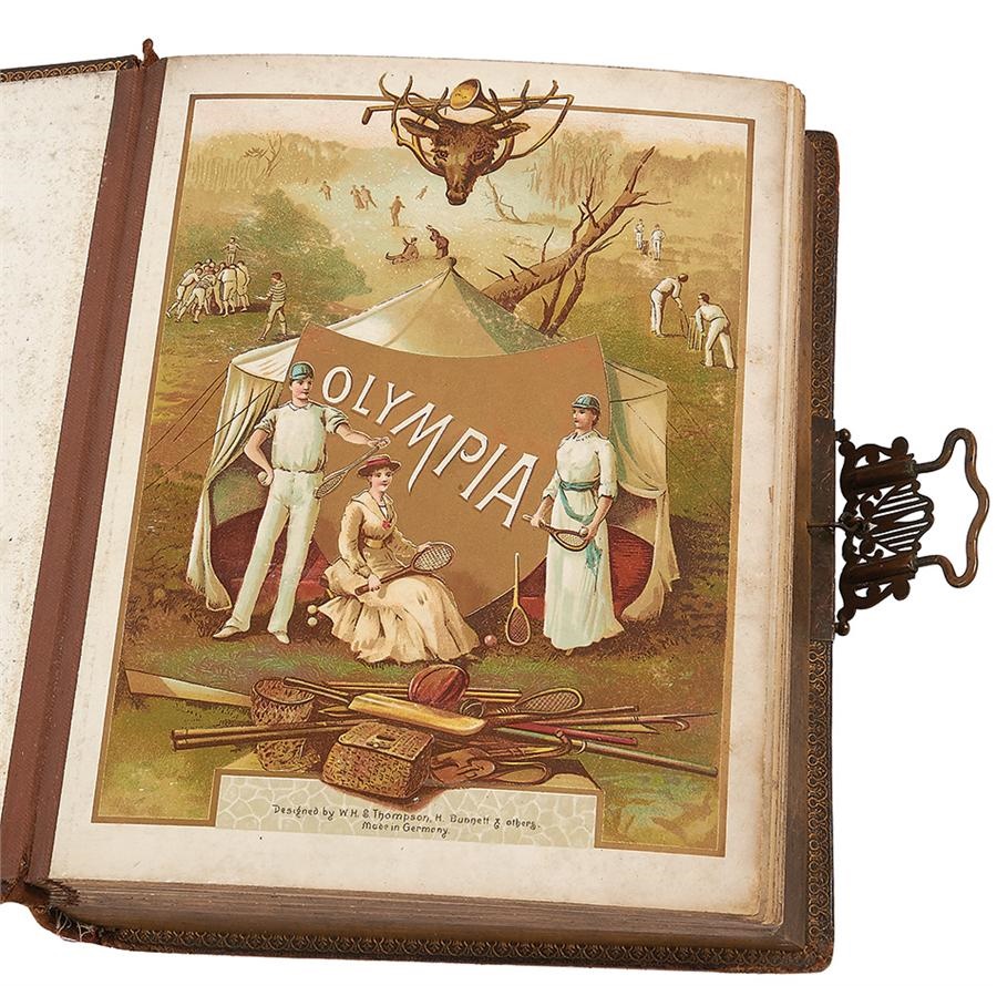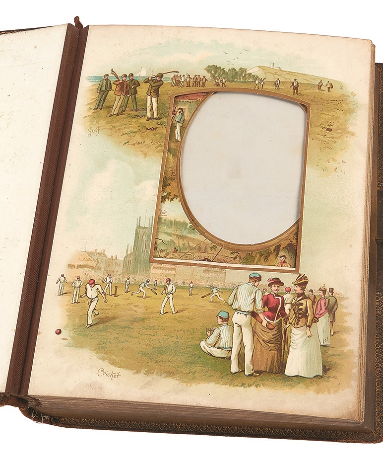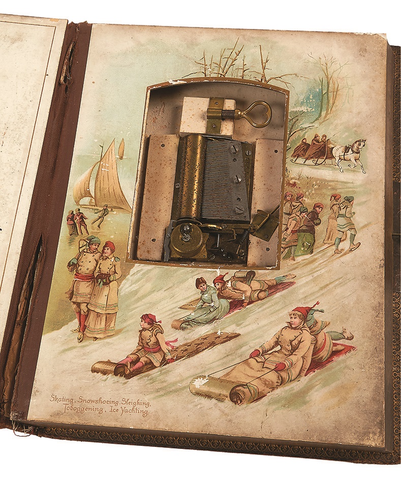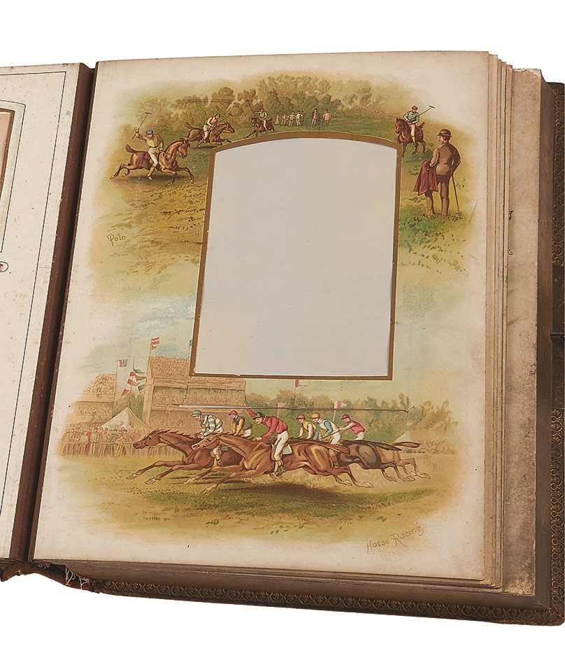 Presenting like an old storybook, this 19th Century photo album comes with a surprise musical element: a music box and original music card, which we have not seen to date. Filled with alluring color litho images, the 9" x 12" tome has suffered some tears regarding the paper backings as photos have been added and withdrawn over the years. The glass window with music box is separated and the binding is loose, but overall it is in VG condition. Includes British cabinet cards and CDVs.
