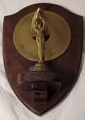 Gorgeous award presented to him the year be broke the major league color line. Giant winged victory stands with arms clasped overhead. Trophy back is engraved, "To Jackie Robinson Athletic Achievement American Women's Business Athletic Club." Engraved in huge numbers "1947." EX and 11".