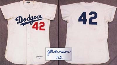 Obtained directly from Rachel Robinson the wife of Jackie Robinson, this important relic was worn by Jackie during his National League Championship season of 1952. The gorgeous home white is in spectacular condition and is the last of the four jerseys that Rachel owned, all now buried in collections and scattered to the ends of the earth. Quite possibly the greatest piece we are offering, in delectable style "Dodgers" is scripted in blue felt across the front with contrasting "42" in red beneath, a symbol of the passionate play of this legend. In the front tail is the bewitching blue embroidered "J. Robinson" with "52" below representing one of his finest seasons. Sleeves are custom shortened to accommodate his flex-ing biceps. A Rawling tag size 42 is ironically on the collar. The verso is blessed with his important "42" in Dodger blue felt. A late acquisition of this jersey in relation to our catalogue deadline left us unable to match the jersey to existing vintage photos of Jackie wearing it. However, it may indeed be a World Series jersey based on the exceptional condition (the best of all the Jackie jerseys the family owned) but does show exceptional use and character. The jersey will include letter of authenticity from Mrs. Jackie Robinson. Jackie Robinson is perhaps the only baseball player in history that truly transcends his sport. This is the final opportunity to own a never before offered jersey direct from the family of the most important baseball player (if not athlete) of all time.