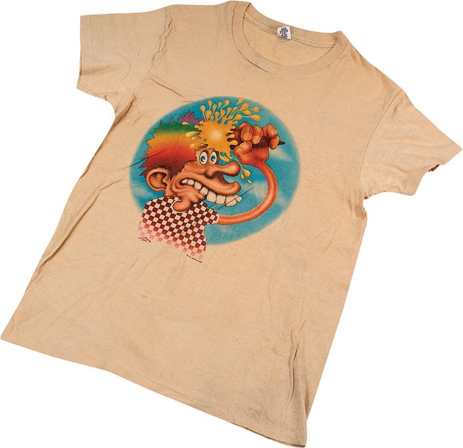 D'oh! This kooky kid misdirected his ice cream cone smack dab into his forehead - one of the Grateful Dead's secondary trademarks during their 1972 tour. Most of these T-shirts from the era are accompanied by the words: "EUROPE 1972" below the cartoon, making this relatively plain large-size shirt something of a collector's item.