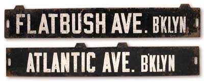 All aboard for Brooklyn Dodgers baseball! Pair of painted metal signs pointed the way to the home of Jackie and Pee Wee. Each two-sided sign measures 4x25". Add some character to your Bums collection.