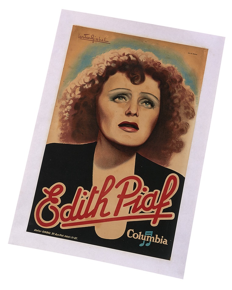 Legendary French chanteuse Edith Piaf signed this rare promotional poster from Columbia Records that is highlighted by brilliant graphics. There is a small amount of restoration at the top left of the linen-backed poster and one missing piece about an inch long has been filled in. This classic, 18" x 26" poster from the same time as her "La Vie En Rose" smash, marvelously captures her essence.