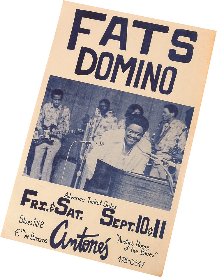 New Orleans-born singer-pianist Fats Domino made a name for himself by finding a thrill on "Blueberry Hill," but here he is well after his heyday, performing in a Blues bar in Austin, Texas. This 10.5" x 16.5" poster with photo of a smiling Fats is in EX-MT condition.