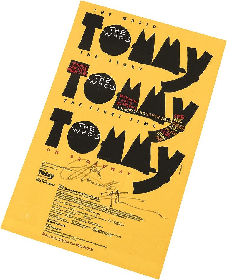 Twenty-four years after it was made into a major motion picture, the Who's "Tommy" shifted to Broadway thanks to Pete Townshend's adaptation. This authentic poster for the show was signed and auctioned off in New York City for Equity Fights AIDS at a performance of the musical. It is autographed by Townshend and bandmate John Entwistle. There is some creasing but otherwise is in EX condition.