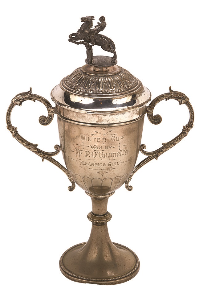 This charming trophy with terrific Victorian look from the turn of the 20th Century is a real beaut. It features a silver plate, two hallmarks and a removable top with rearing figural rider, There is a small defect on the base that makes it a bit wobbly, but it can be pounded out with little trouble. The engraving reads: "WINTER CUP WON BY MR. P. O'DONNELL'S CHARMING GIRL" on one side and "BROOD MARE SHOW BALLYNEETY 1900." Quit horsing around and get your bid in today!