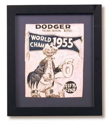 A fine piece of Mullin art, this cover shows the Bum looking to reuse the 1955 World Championship banner. Across the Bum's lapel are twenty-eight signatures including Robinson, Campanella, Snider, Reese, Hodges, Koufax, Gilliam, Newcombe, Furillo, Erskine, Zimmer, Loes, Craig, Drysdale, and even Walter O'Malley. This is the cover only. A close cut slightly affects some of the sig-natures. Nicely framed, this makes for a display worthy of Flatbush. Overall EX.