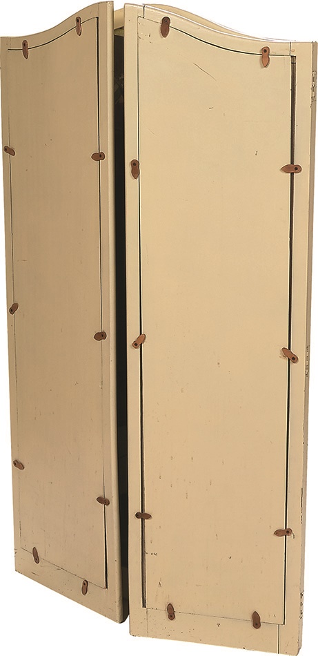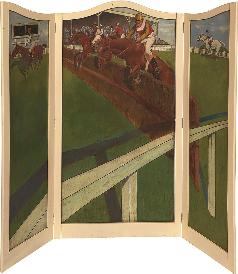 Thundering horse scenes adorn this spectacular painted screen that came out of the Los Angeles area. Measuring 63" x 57", the fascinating piece is extremely functional and engaging in any home. It is an important example of the enigmatic WPA (Work Progress Authority) style of talented artists and craftsmen finding work through the social programs of President Franklin Delano Roosevelt.