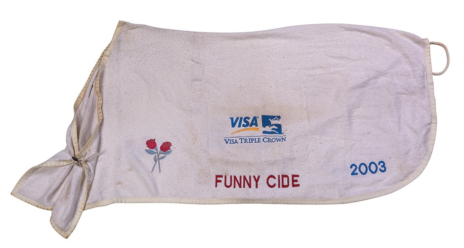The "People's Horse" - Funny Cide - brought the "everyman" into horse racing and brought fame to a group of friends from Sackets Harbor, New York. In winning the 2003 Kentucky Derby, Funny Cide became the first New York-bred horse to win the Derby and the first gelding to prevail since Clyde Van Dusen in 1929. His Derby win was named "Moment of the Year" by the NTRA, and with good reason. For his career, Funny Cide earned over $3.5 million and was named Champion 3-Year-Old Colt in 2003. This white blanket with red lettering and VISA TRIPLE CROWN logo was presented to Funny Cide in the winner's circle after his historic win.
