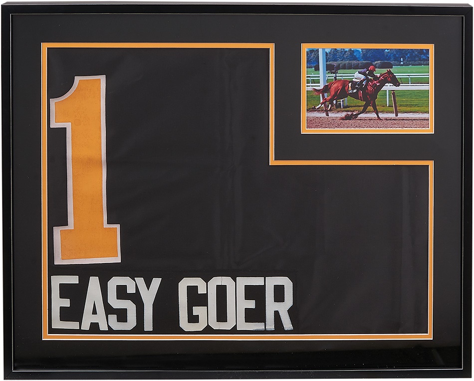 One of the most versatile horses in recent memory, Easy Goer had that rare combination of speed and endurance. He ran the fastest mile ever won by a three-year-old yet holds the distinction of running the second fastest Belmont Stakes in history (behind only the immortal Secretariat). A champion at age two, Easy Goer is best remembered for his classic duels with Sunday Silence in the Triple Crown races and the Breeders Cup Classic, but his Hall of Fame career stands on its own. This rare silk saddle cloth comes from Easy Goer's winning 1989 Woodward Stakes and has been professionally framed along with a picture from that historic race. Expertly matted/framed to the dimensions of 25.75" x 22.5".