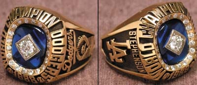 Genuine article was presented to a scout responsible in part for assembling this World Championship team. Large real diamond in face is set in a blue stone surrounded by smaller diamond studs and the text "1988 World Champion Dodgers." Scout's name "Stephenson" above the "L.A." logo on the left shank; right shank has classic Dodgers logo and a miniature World Series trophy. Size 14.