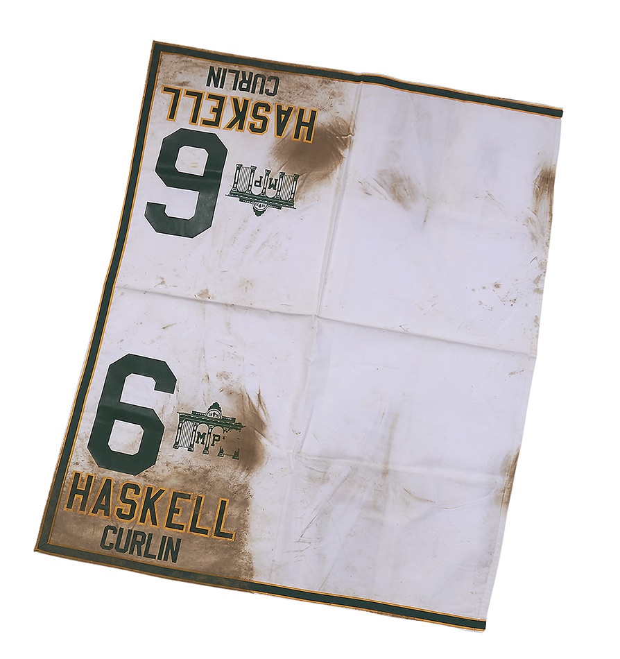 The biggest North American money earner of all-time, with over $10.5 million accumulated, Curlin won several major races during his amazing career, including the 2007 Preakness Stakes, 2007 Breeders Cup Classic and the 2008 Dubai World Cup. A two-time Horse of the Year, Curlin won 11 of 15 career races and only once finished out of the money. This white saddle cloth with green lettering and #6 was worn by Curlin in his third-place finish in the 2007 Haskell Invitational and contains a ton of dirt from the track on that historic day.