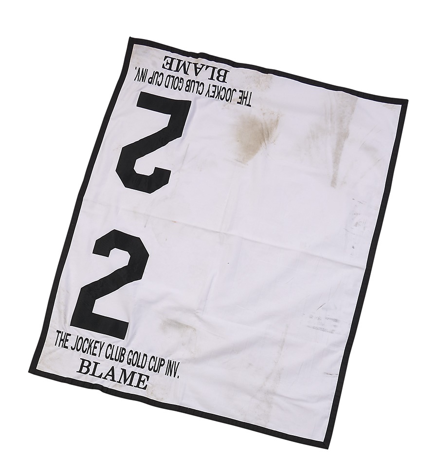 During his racing career, Blame was a winner of nine races in 13 starts, but he is best known as the only horse ever to beat the super-mare, Zenyatta, in winning the 2010 Breeders Cup Classic in a dramatic finish. All told, Blame earned $4,368,214 on the track and never finished out of the money. This white cloth with black lettering and #2 is from Blame's runner-up finish in the 2010 Jockey Club Gold Cup.
