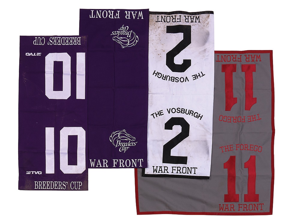 A son of Danzig, War Front won the Alfred G. Vanderbilt Handicap and finished second in the Forego Handicap and Vosburgh Stakes. War Front now stands as a stallion at Claiborne Farm in Paris, Kentucky, where his 2015 stud fee is $150,000 - one of the highest in North America. Since retiring from racing, he has sired Data Link, Declaration of War, Summer Soiree, The Factor and War Command. Offered here are four cloths from 2006: War Front's 2nd place Vosburgh and Forego cloths and his race and exercise cloths from the Breeders Cup Sprint.