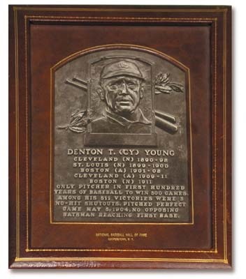 The one and only plaque presented to Cy Young upon his Induction into the National Baseball Hall of Fame in Cooperstown, New York. Brown leather frame is lovingly deco-rated and imprinted in gold leaf, "National Baseball Hall of Fame...Cooperstown, N.Y." Frame is custom-cut to fit the dome-topped plaque that honors the man they named pitching greatness after. Image of the plaque inside is a real photograph and details his amazing baseball story from his winning 500 over games to his perfect game. These metal plaques were hung in the Hall of Fame's museum gallery while this version was pre-sented to players only. This is only the second one we have seen sold with the other being Jackie Robinson. 12x10". EX+.
