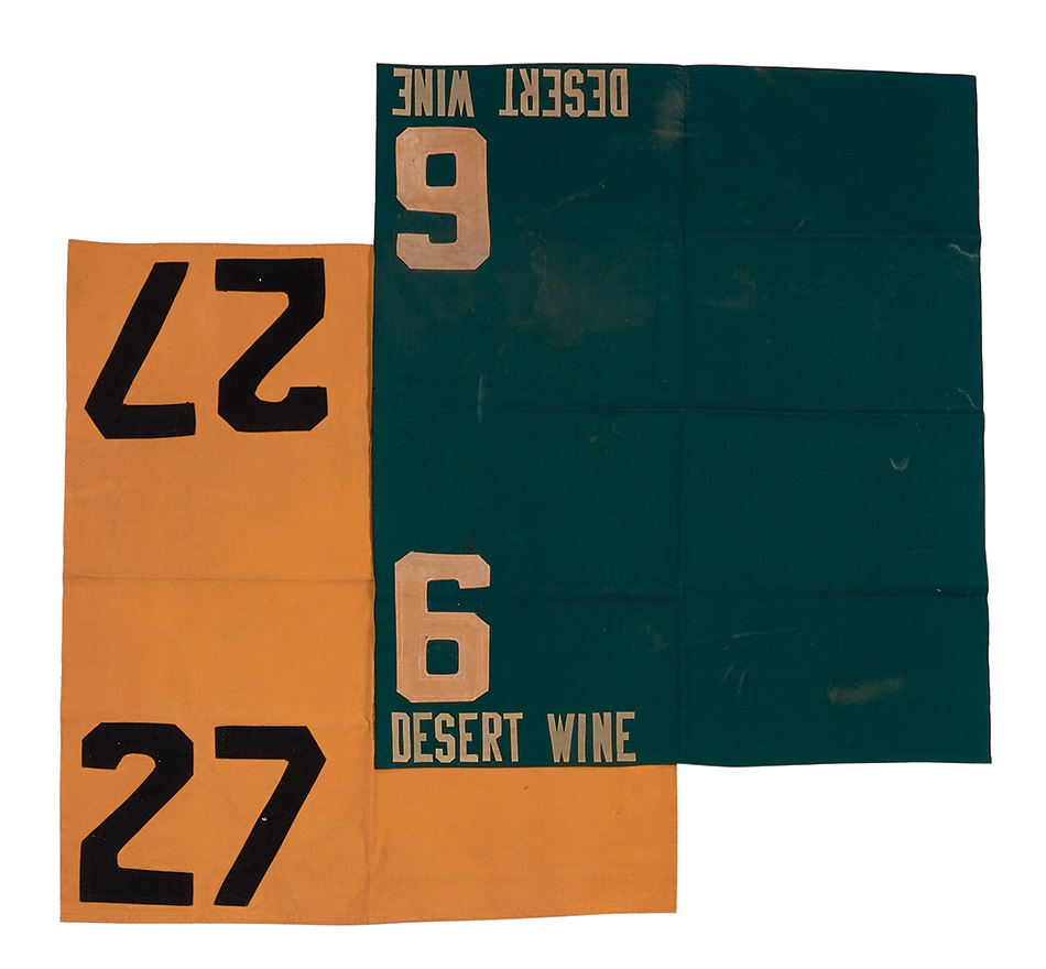 In the 1983 Kentucky Derby, Desert Wine finished second to Sunny’s Halo after a hotly contested stretch drive, a moment commemorated by the famous Sports Illustrated cover. That day, he defeated Belmont winner Caveat and Hall of Famer Slew O’ Gold. Desert Wine won seven graded stakes, including a victory over John Henry in the 1984 Hollywood Gold Cup. He earned over $1.6 million racing in the early 1980s, equivalent to about $3.7 million today. Desert Wine was sired by Hall of Famer Damascus out of the 1999 Broodmare of the Year Anne Campbell, and has himself sired multiple Grade 1 winners Subordination and Ballingary. Offered here is the green, race-worn saddle cloth from Desert Wine's runner-up Derby finish, along with the exercise cloth that he wore in the week leading up to the big race in his morning breezes. This is a rare opportunity to obtain some of the oldest Derby cloths known to exist.