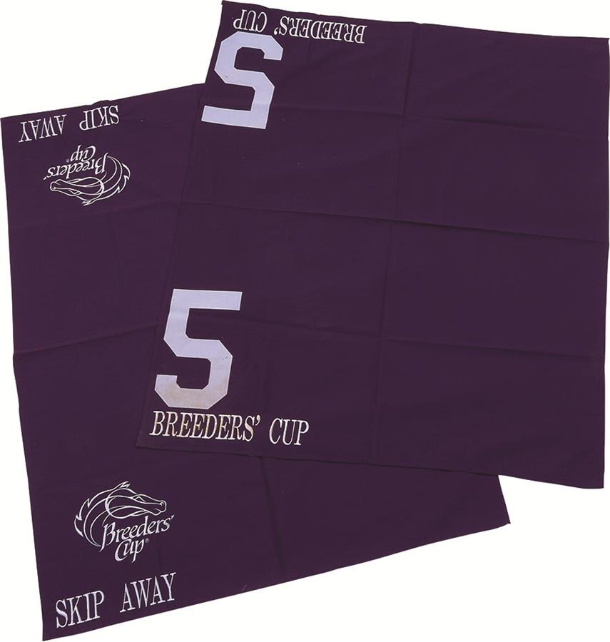 Lot # 31: Skip Away Breeders Cup Classic Set - Race Worn Cloth and Exercise Cloth
