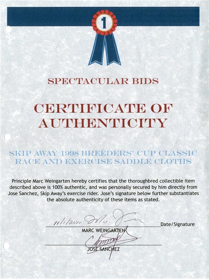 “Skippy” was one of the most decorated racers in history, being named Eclipse Champion Three-Year-Old Male in 1996, Champion Older Male in 1997 and 1998, and 1998 Horse of the Year. Winner of 10 Grade 1 events, two of his signature races were a victory over Cigar in the 1996 Jockey Club Gold Cup and a five-length victory in the 1997 Breeders’ Cup Classic. The fourth-leading thoroughbred money earner of all time (as of 02/09/2015), Skip Away won over $9.6 million in his brilliant career. He was elected to the Thoroughbred Hall of Fame in 2004, and Blood-Horse Magazine ranked him the 32nd greatest American thoroughbred of the 20th century. In the 1998 Classic, Skip Away ran on a bowed tendon and finished sixth in this, his last race. Offered here is the regal purple saddle cloth worn by Skip Away during the 1998 Breeders Cup Classic, along with the exercise cloth he wore that week in workouts.