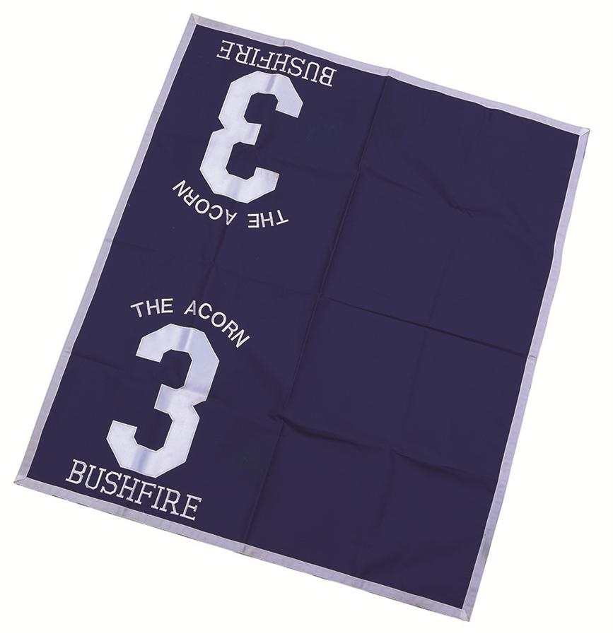 A multiple-graded stakes winner, Bushfire won three of the major races for 3-year old fillies in 2006, when she came home first in the Ashland Stakes, Acorn Stakes and Mother Goose Stakes. This blue cloth with white lettering and #3 was worn by Bushfire in her victorious Acorn Stakes triumph.