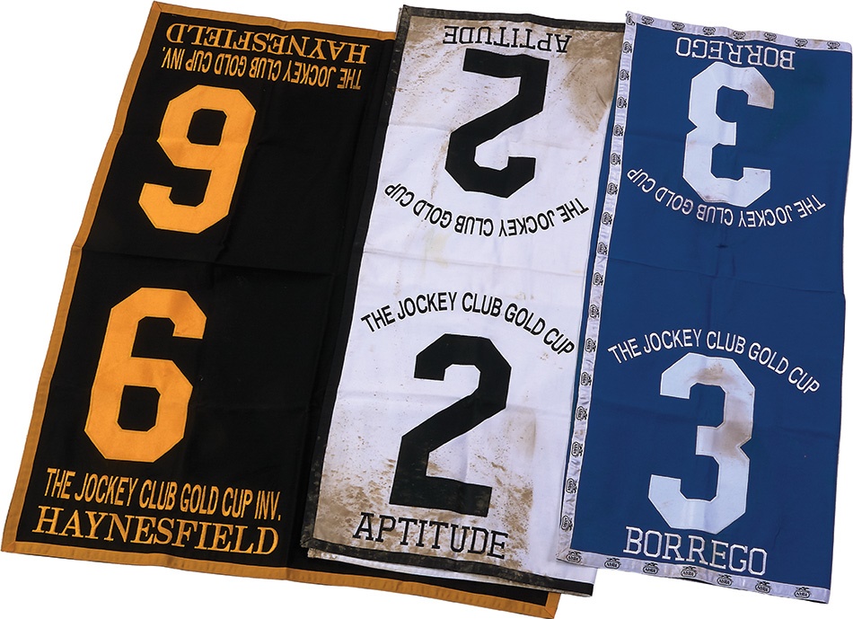 This plentiful lot includes the three winning saddle cloths from the 2001, 2005 and 2010 editions of the historic Jockey Club Gold Cup, the past winners of which are a veritable Who's Who of award-winning Hall of Fame horses, including Man O'War, War Admiral, Citation, Whirlaway, Gallant Fox, Nashua (twice), Buckpasser, Damascus, Forego, John Henry, Affirmed, Easy Goer, Skip Away and Curlin. The great gelding Kelso won the race a record five times. The 1978 running matched up Affirmed and Seattle Slew, marking the first time two Triple Crown winners faced one another on the track.