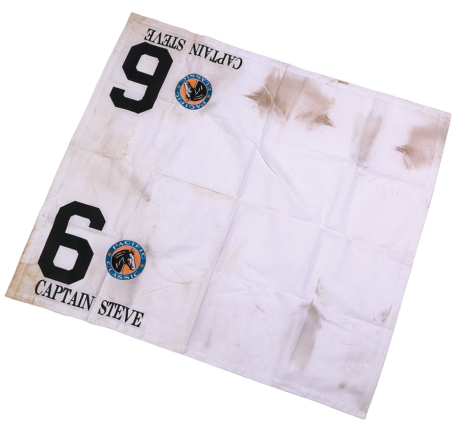 A winner of nearly $7 million during his racing career, Captain Steve's biggest victories came in 2001, when he won the Donn Handicap and the legendary Dubai World Cup. After his racing career concluded, Captain Steve was sold to the Japan Racing Association (JRA) to stand at Shizunai Stud. This white cloth with black lettering and #6 was worn by Captain Steve in the 2001 Pacific Classic. It contains the race's logo.
