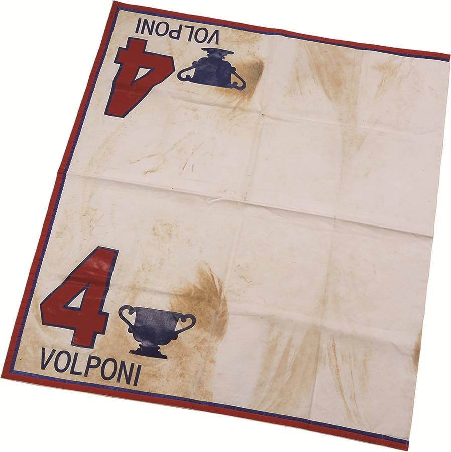 A winner of over $3 million in earnings, Volponi recorded the most important win of his career in 2002 when he took America's richest horse race, the Breeders Cup Classic, by six-and-a-half lengths - the largest margin in the race's history. In winning the Classic, Volponi overcame odds of 44-to-1 to beat an outstanding field that included runner-up Medaglia D'Oro, War Emblem, Harlan's Holiday, Evening Attire and Macho Uno. In 2003, he made eight starts without a win but had five seconds and two third-place finishes. This white cloth with red #4 and blue lettering is from his second-place finish in the 2002 Meadlowlands Cup and exhibits plenty of great wear.