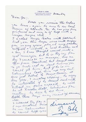 Two pages to close friend Joe Clements, business man-ager/ announcer for Twin Falls Cowboys, Class C. Gives him advice in selecting new manager for the '51 season. Cobb suggests current California PCL players or man-agers Augie Galan (Oaks), Joe Marty (Solons), Holder (Seals) and Marv Owen (San Jose, Class C). On personal letterhead. Signed in full, with initialed postscript. Ink and all pages are NRMT.