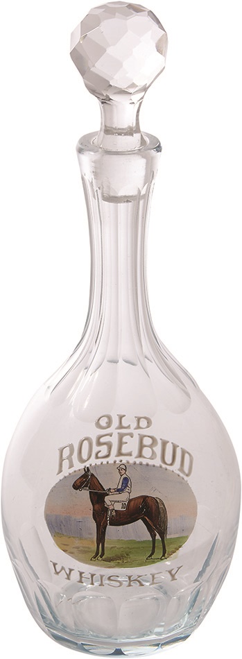 1914 Kentucky Derby winner Old Rosebud graces the front of this 9"-tall, hand-blown whiskey bottle that is of exceptional quality, featuring original enamel painting with gorgeous color. The back bar bottle is extremely rare and but for a couple of chips on the stopper, it is in EX condition.