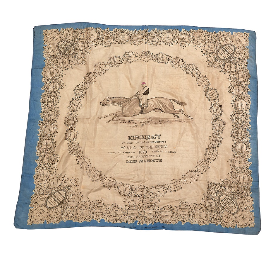 This impeccable silk scarf is magnificent in both its condition and detail. The 32" x 35" relic features print commemorating King Tom out of Woodcraft for winning the Kingscraft Derby, with shout-outs to trainer M. Dawson and the Lord Falmouth in 1870. Around the edges are previous winners. Incredibly, the silk is in EX-MT condition. Actually near-perfect.
