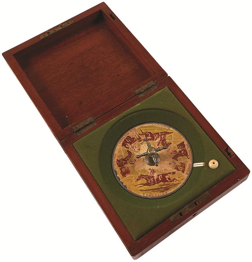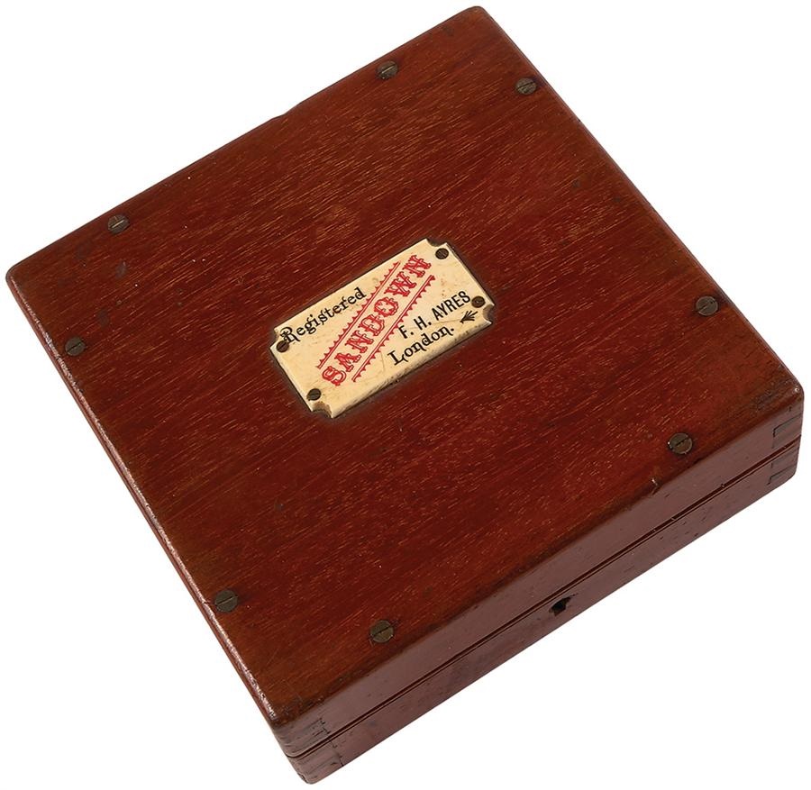 In 1875, Sandown Park opened its gates in Surrey, England, and shortly thereafter, this luscious wooden box was named for the famed racecourse. It measures 6" x 6" and is distinguished by a bone plaque on the top with "SANDOWN REGISTERED F.H. AYRES LONDON" printed. The inside of the box is lined in green felt and features names of period horses. It is missing the ball and key.