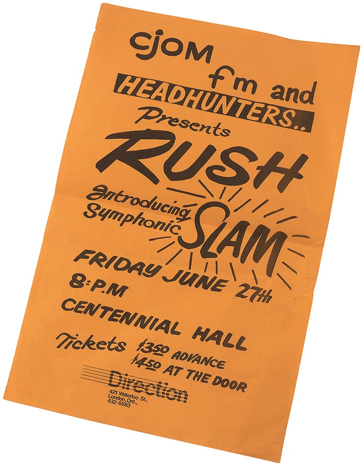 Less than one year after Neil Peart took over as drummer, the Canadian progressive rock band Rush was starting to tour and make people take notice on a broader scale. Here's an 11" x 17" concert poster promoting the band's June 27, 1975, show at Centennial Hall in London, Ontario - not far from its Toronto home. Old radio station CJOM is listed at the top. The yellow poster is folded but otherwise EX.