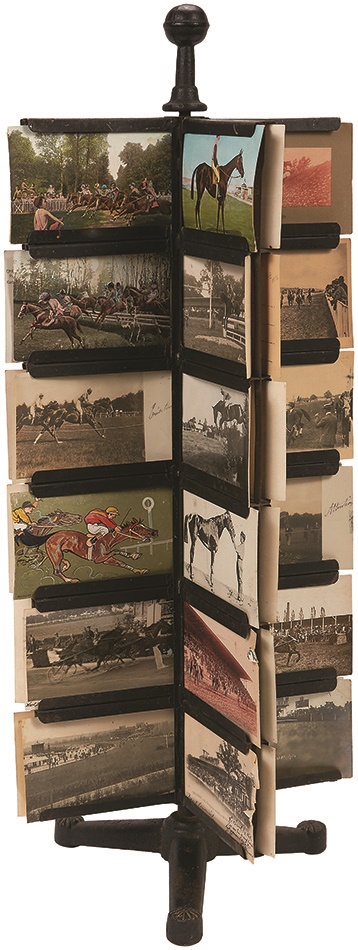 A point-of-purchase display from an old shop, this rack is filled with horse and horse racing postcards mostly from the early 1900s and no later than the 1920s. About half are real photo postcards. Looks incredible as a display with ornate feet and capped top. EX condition.