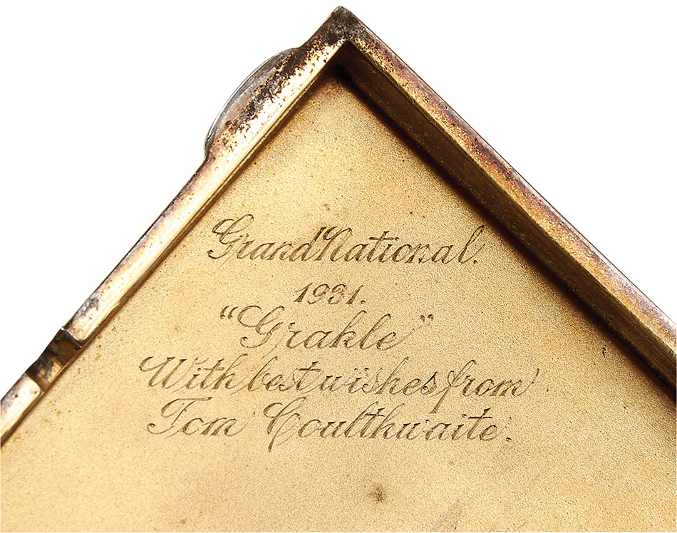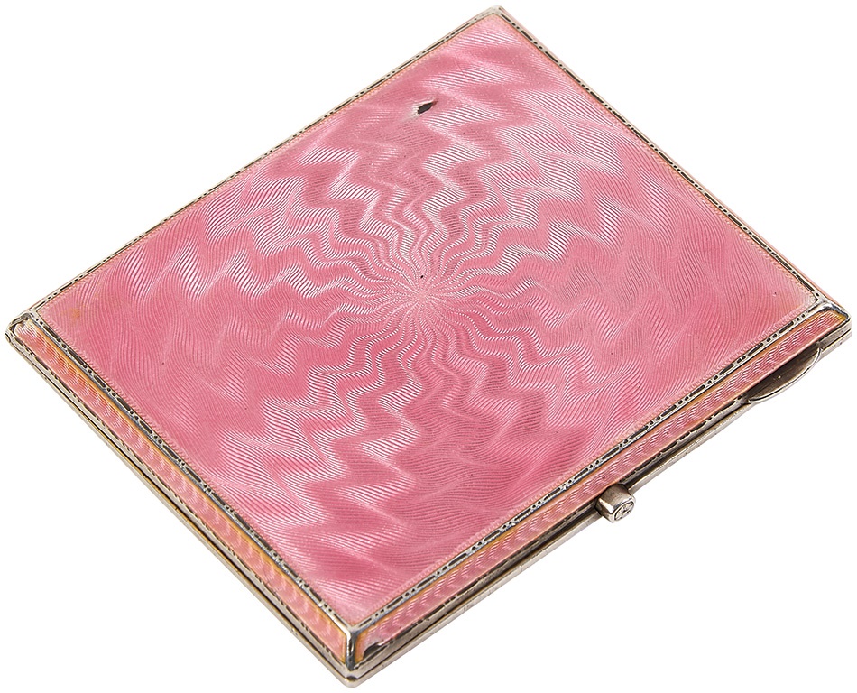 After the 1931 Grand National horse race took place in Liverpool, England, this pink cigarette case with Kaleidoscope-like pattern on the face was presented to Tom Coulthwaite, the trainer of steeplechase winner Grakle. The case is comprised of cloisonne enamel on silver, and there's a tiny chip on the front but otherwise is in EX-MT condition. The case consists of solid silver with hallmarks.