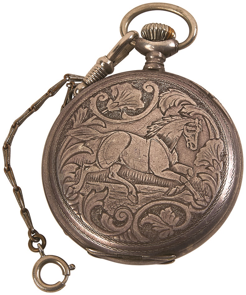 Featuring a polo player on the front and acid-etched horse on the back, this elegant Zenith Grand Prix pocket watch still keeps exact time. The dial is a beautiful Zenith hallmark enamel in EX condition, with no cracks or chips, and there's a seconds dial sunken in at 6 o'clock.