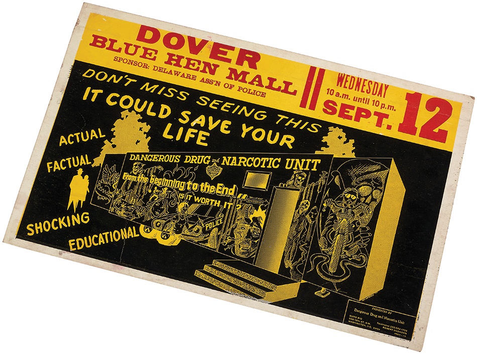It was the "Just Say No" of the 1950s. This 14" x 22" window card from the Dover, Delaware, Police Department promotes an informative, anti-drug meeting intended to "save your life." Dramatic graphics posted on the "Dangerous Drug and Narcotics Unit" building are spooky and provocative and the poster is in VG-EX condition.