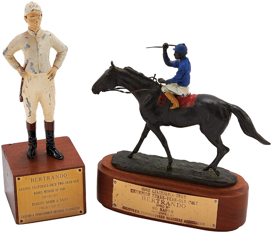 1993 California Horse of the Year Bertrando was a tall colt who racked up major wins throughout the early part of the decade. Among the prizes he won along the way were these two: a handsome bronze statue of horse and rider that measures 10.5" x 9" and is in EX condition overall, with the bronze being unsigned. The plaque commends the three-year-old champion and his breeder Ed Nahem presented by the California Thoroughbred Breeders Association. The metal statue of the jockey is over 12" tall and also features a plaque on its wood base from the same group acknowledging the "Leading California-bred Two-year-old" as the "Money winner of 1991." There is some loss to the paint but it still presents well.