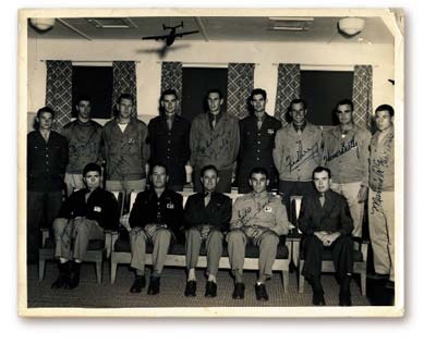 Wire photograph snapped dur-ing World War II pictures a grouping of top American ath-letes serving their country over-seas. There are football, basket-ball and baseball figures here, all signing over their images, but most notable is the Yankee Clipper, whose autograph is 9+/10. Photo shows definite wear, but the signatures and overall eye appeal are not affected adversely.