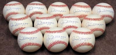 The ultimate dealer's lot, or an investment sure to beat Nasdaq and the Dow. Each OAL baseball bears a perfect 10/10 sweet spot signature from the great Yankee. Letter of authenticity from the DiMaggio Estate for each is included, offering the strongest provenance humanly possible. It just doesn't get any better than this.