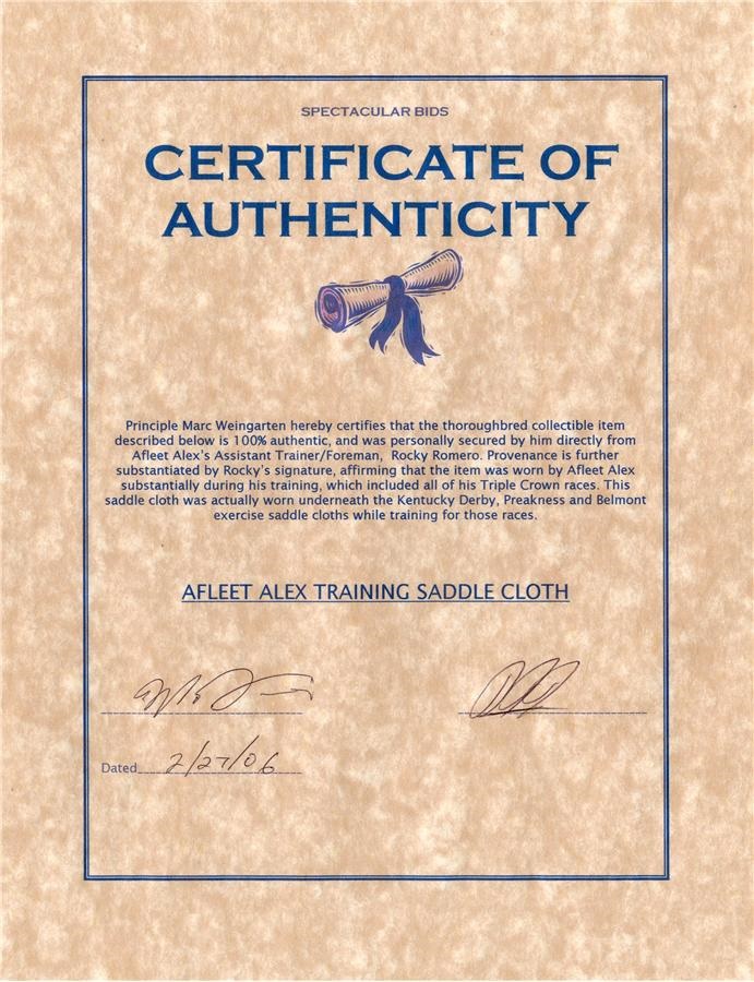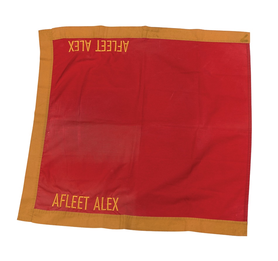 Fan favorite Afleet Alex was the runaway winner of the 2005 Preakness Stakes and Belmont Stakes. He also came home first in the Hopeful Stakes, Sanford Stakes and the Arkansas Derby. "Alex" won 8 of 12 races during his brief racing career and earned $2,765,800 before retiring to Gainesway Farm in Lexington, Kentucky. Offered here is the red saddle cloth with gold lettering and trim as it was worn by Afleet Alex during his training sessions throughout his Eclipse-winning 3-year-old campaign. It is accompanied by a Certificate of Authenticity attesting to its usage.