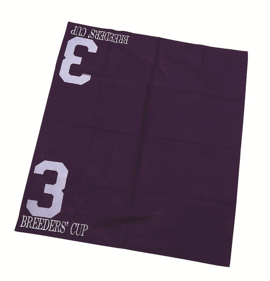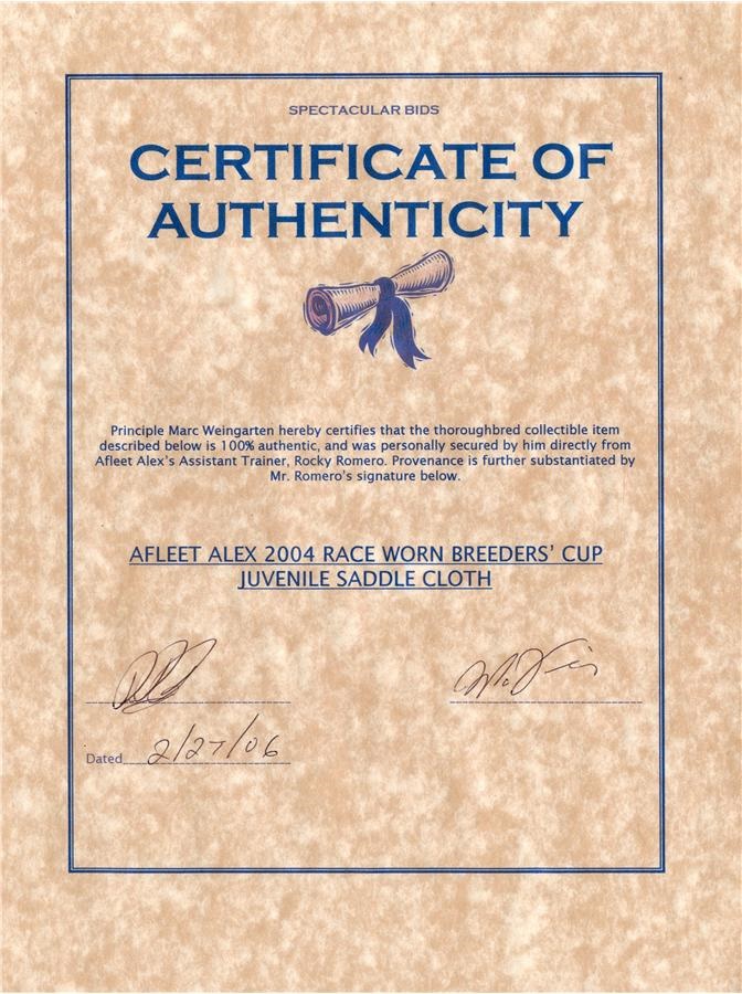 Afleet Alex was the runaway winner of the 2005 Preakness Stakes and Belmont Stakes, while also coming home first in the Hopeful Stakes, Sanford Stakes and the Arkansas Derby. A fan favorite, "Alex" won eight of 12 races during his brief career and earned $2,765,800 before being retired to Gainesway Farm in Lexington, Kentucky. Offered here is the purple saddle cloth with white lettering that Alex wore during workouts at Lone Stark Park for his runner-up finish in the 2004 Breeders' Cup Juvenile.