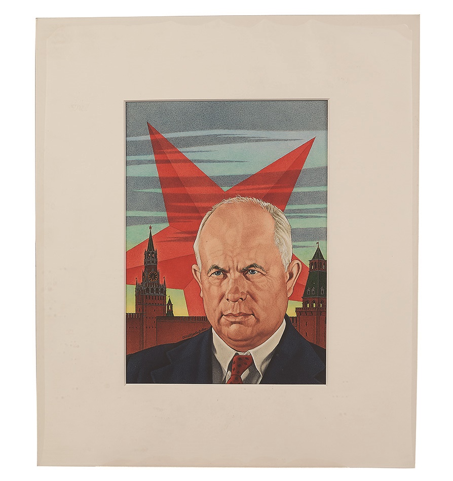 Commissioned in 1955, this stunning gouache on heavy artist's board shows the Russian Premier at the peak of his powers. The quality and look is captivating; ebullient, brash, impetuous, Krushchev dominated the USSR during the Cold War, yet prepared the way for Perestroika. As premier, he stirred the world pot with the Hungarian Revolt, Sputnik I, Berlin War Crisis, Cuban Missile Crisis and De-Stalinization. This piece itself is 13.5" x 17.5", archivally matted to 19" x 22" overall. Includes artist's notes on back of painting: EHB #3.