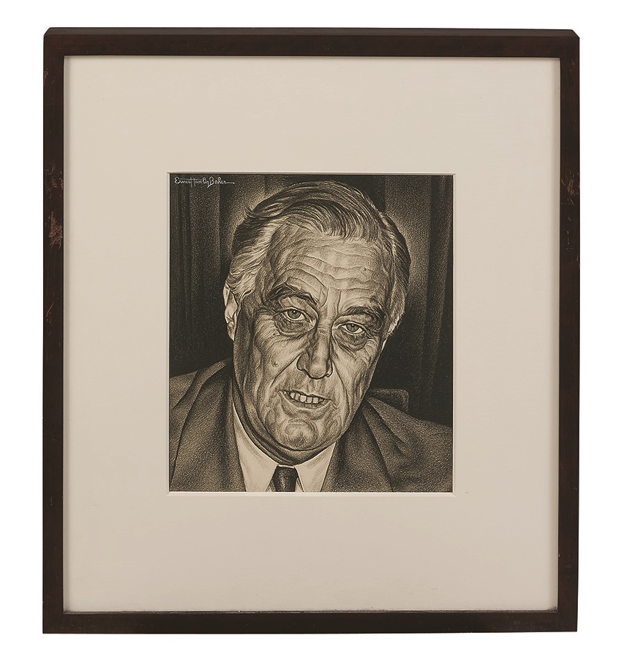 This is the original version of FDR's cover by Ernest Hamlin Baker for the 1941 "Man of the Year" issue published on January 5, 1942. This is the original version, just slightly changed in the second draft. The image was reproduced for Naval Magazine in October 1999 and was recently loaned to the Smithsonian. Baker drew this image just days after the attack on Pearl Harbor and revised it slightly afterward to include Churchill and Stalin for the finished product. The piece itself is 11" x10", in pencil/charcoal on heavy artist's board. Archivally framed to 18.5" x 20.5" overall.