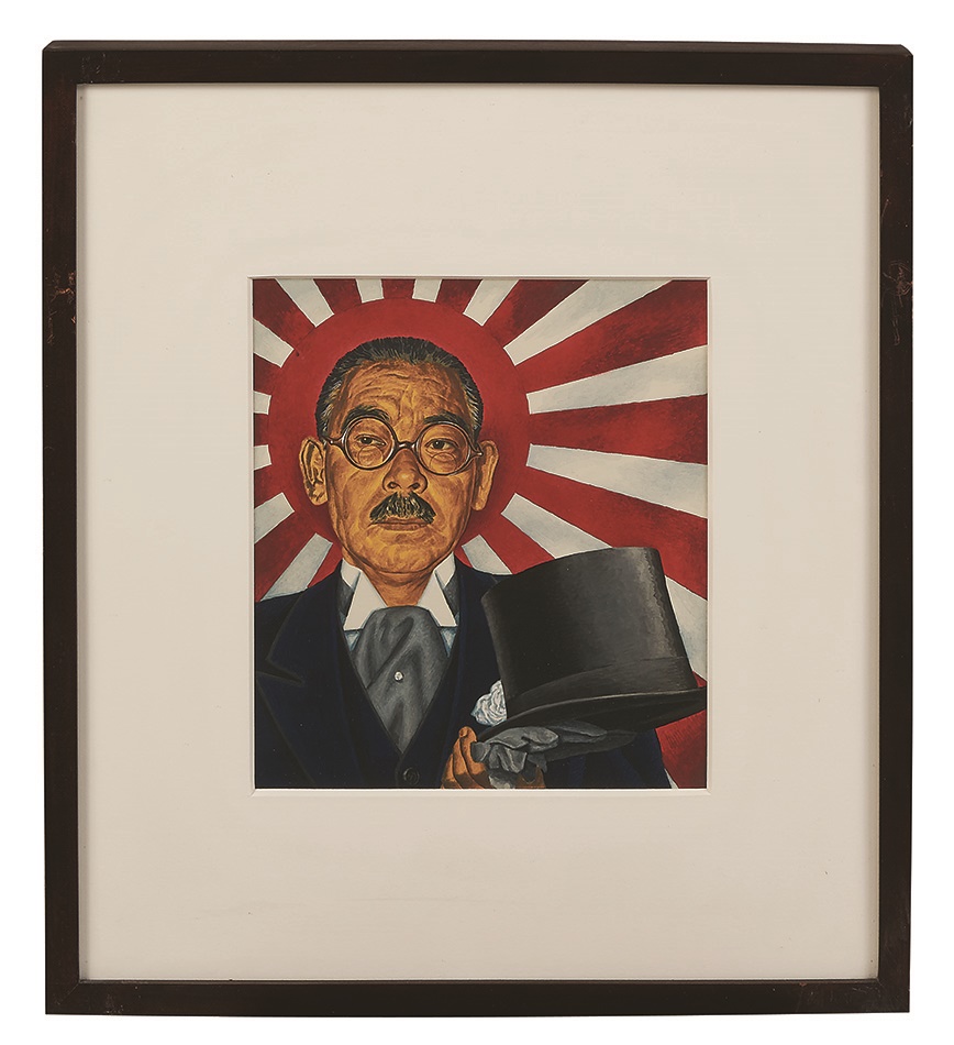 Fabulous gouache on heavy artist's board is the perfect visual embodiment of the Rising Sun military of WWII. Used for the cover of the July 7, 1941 issue of TIME, we cannot see the signature of Baker on this piece (it may be covered by the matte), but it is undoubtedly his work. The strident Japanese foreign minister who took his country in WWII Unity Pact with Germany and Italy is shown at his most powerful. Archivally framed to 18.5" x 20.5" overall.
