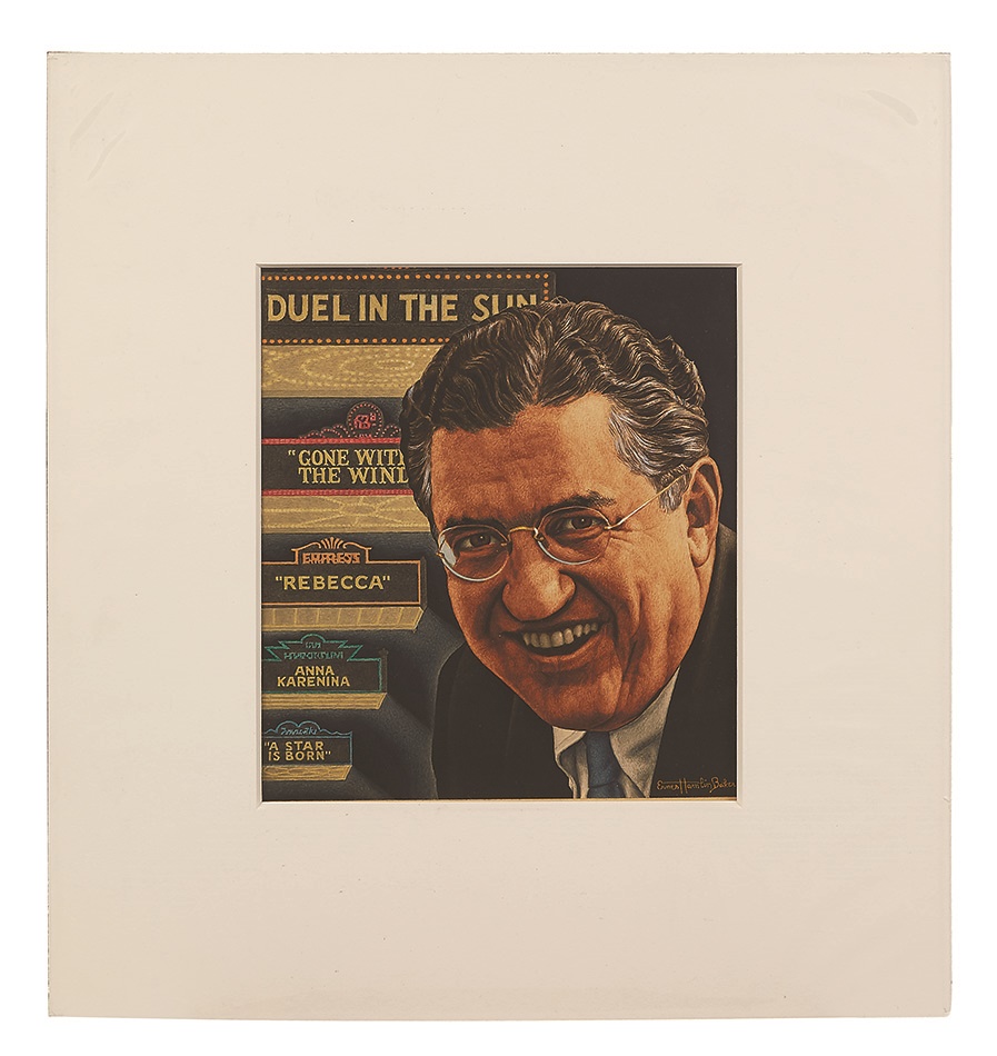 Commissioned in 1944 for a proposed cover for TIME Magazine that was bumped for a bigger story, this original painting by Ernest Hamlin Baker is a pure Hollywood design that shows the Father of "Gone with the Wind" with his hefty movieography of titles in the background as a stunning city of lights. Gouache on heavy artist’s board. This celebrated Hollywood producer generated Gone with the Wind and Rebecca (among others), both of which earned Oscars for Best Picture. The piece itself is 11.5" x 12.5”, and archivally matted to 16.75" x 17.75” overall. Includes artist's notes on back of painting: #145 VW.