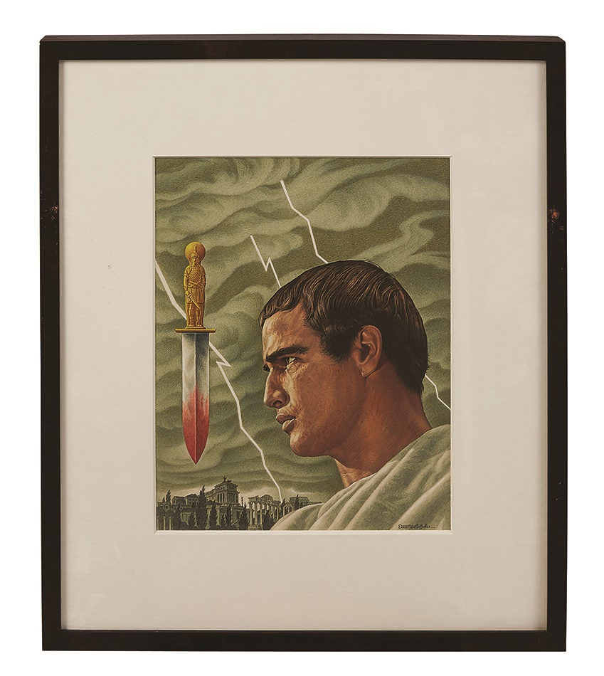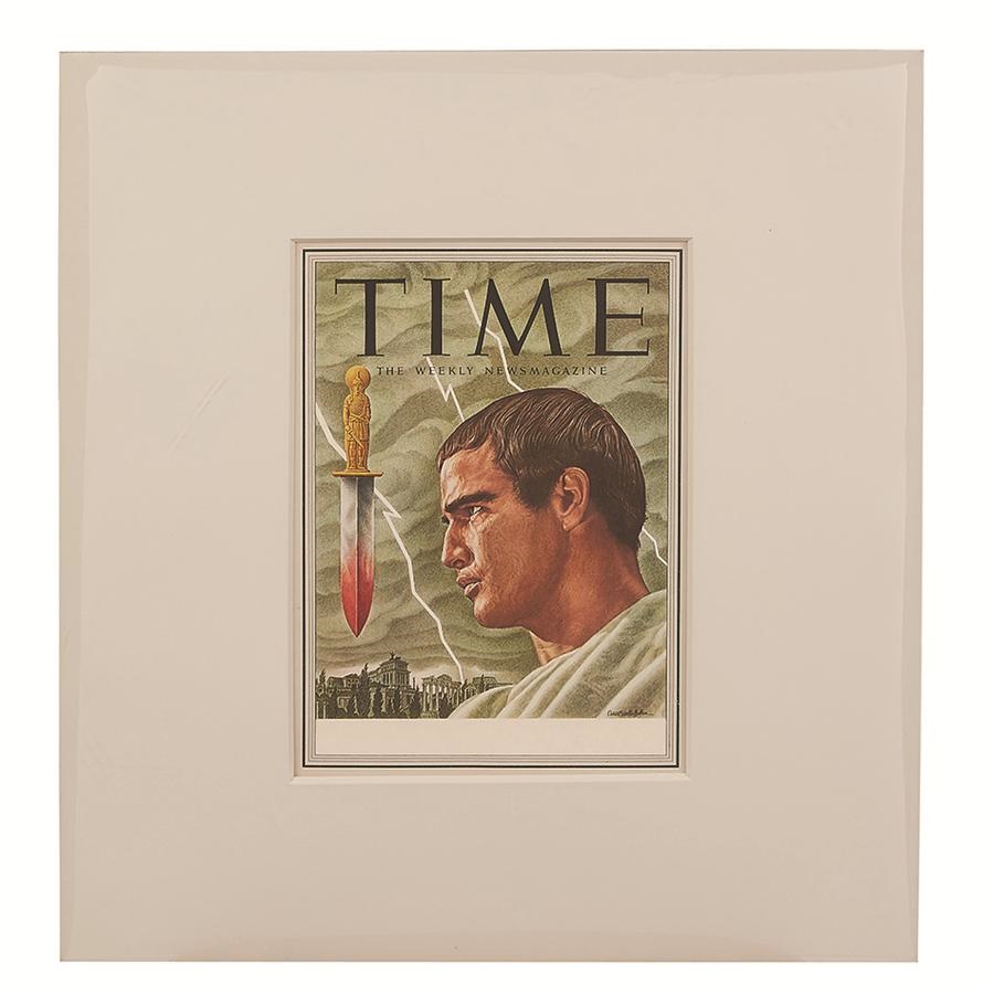 Offered here is a spectacular work by Ernest Hamlin Baker commissioned in 1953 as a proposed cover for TIME. Included in this lot is a one-of-a-kind proof cover created for this proposed subject - he made it to the cover of LIFE Magazine instead. This stage and screen idol famous for his brooding portrayals is shown in his tour de force, Julius Caesar. Brando earned four Oscar nominations, yet refused the Best Actor Oscar for The Godfather. Special gouache on artist’s board is archivally framed to 19" x 23" overall, and the proof itself is 8" x 10.75" and archivally matted to 16.5" x 17.75" overall.