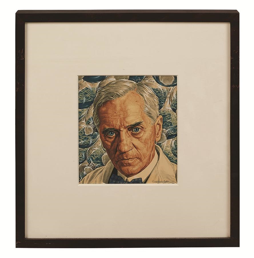 From the May 15, 1944 cover art of the British bacteriologist who recognized the germ-killing powers of the blue-green mold Penicillin Notatum - he received the Nobel Prize for his 1928 discovery. A marvelous gouache on heavy artist’s board. the piece itself is 8.75" x 8”and archivally framed to 17.75" x 18.75".