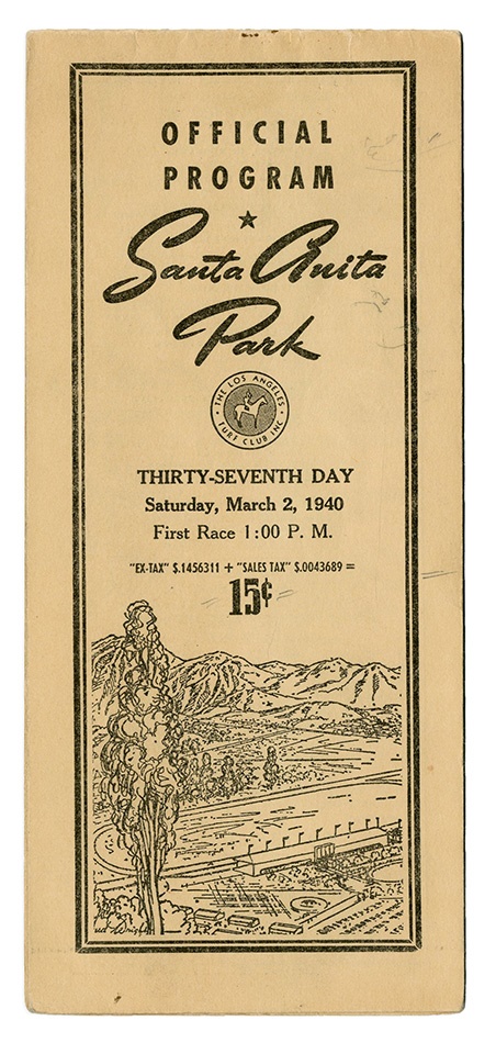 The Santa Anita Handicap was the only race that had eluded Seabiscuit during his brilliant career. Until 1940, that is, when the champion racehorse prevailed in his final race. Here's the official race program from that March afternoon. There are pencil marks to the interior denoting the winners, scratches and even a few payouts. It is in EX condition.
