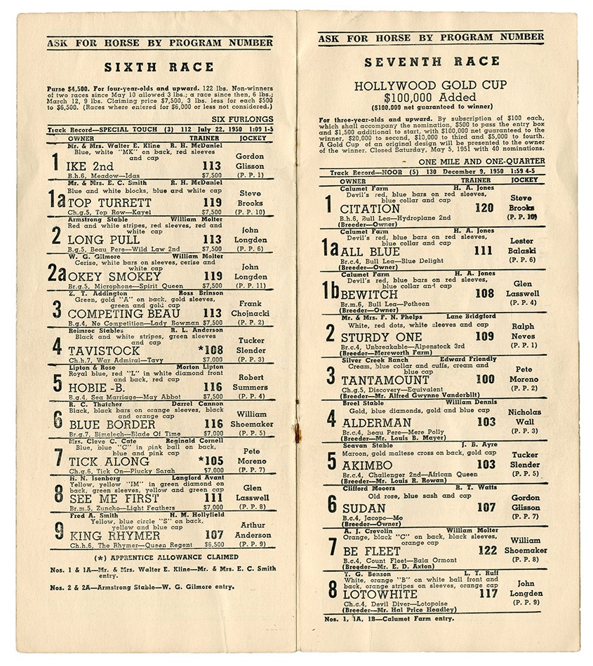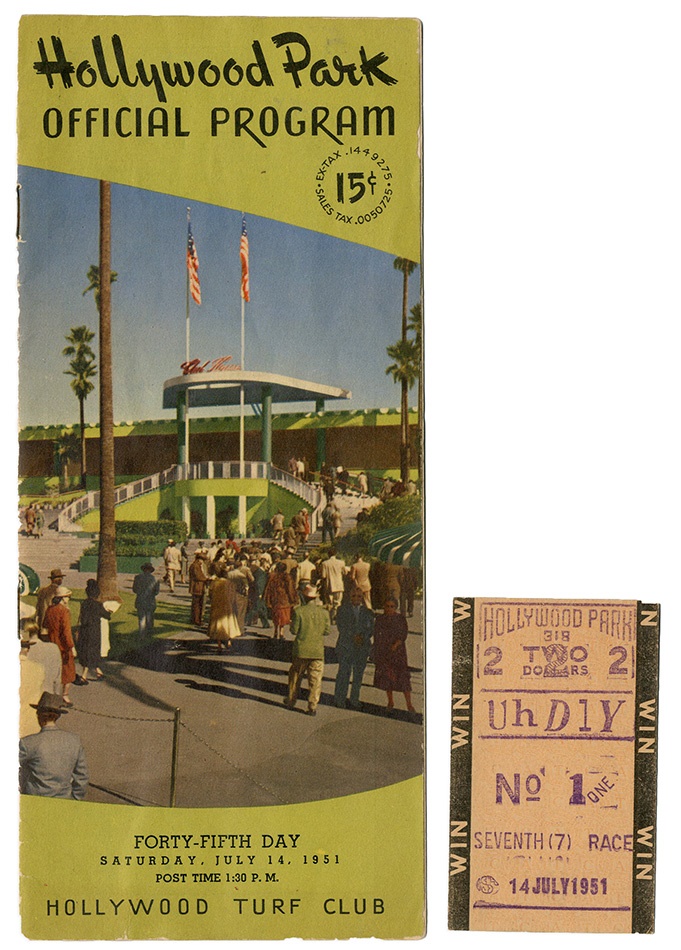 Citation won the Triple Crown in 1948 and continued to race for three more years. From his very last competition at Hollywood Bowl in 1951 comes this program (EX) and winning ticket (EX-MT). The race was intended to make him the first horse with over a million in earnings, and that's exactly what happened as Citation ended with a bang, taking the Hollywood Gold Cup over his stablemate, the mare Bewitch. He was then retired to stud. Not a bad way to end a career.