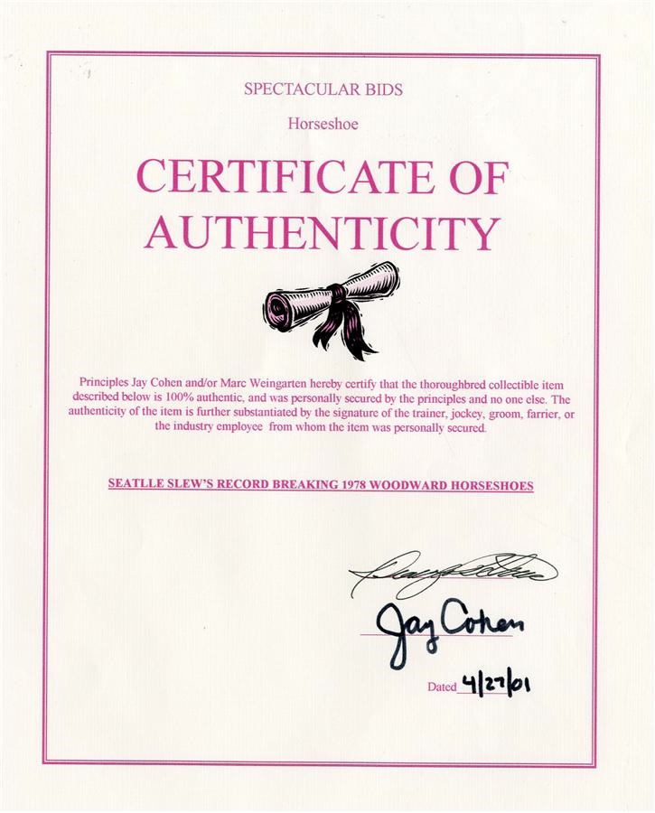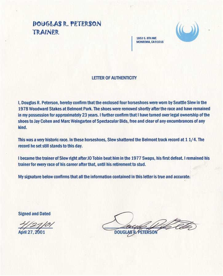 Seattle Slew slayed the competition in 1977, becoming the 10th of 11 thoroughbreds to capture the Triple Crown. This race shoe was worn by the great Slew during his track record performance in the 1978 Woodward Stakes. It comes with a Certificate of Authenticity signed by his first trainer, Doug Peterson. After he "retired," Seattle Slew stood at stud and sired many progeny, including Swale, who won the Kentucky Derby and Belmont Stakes.